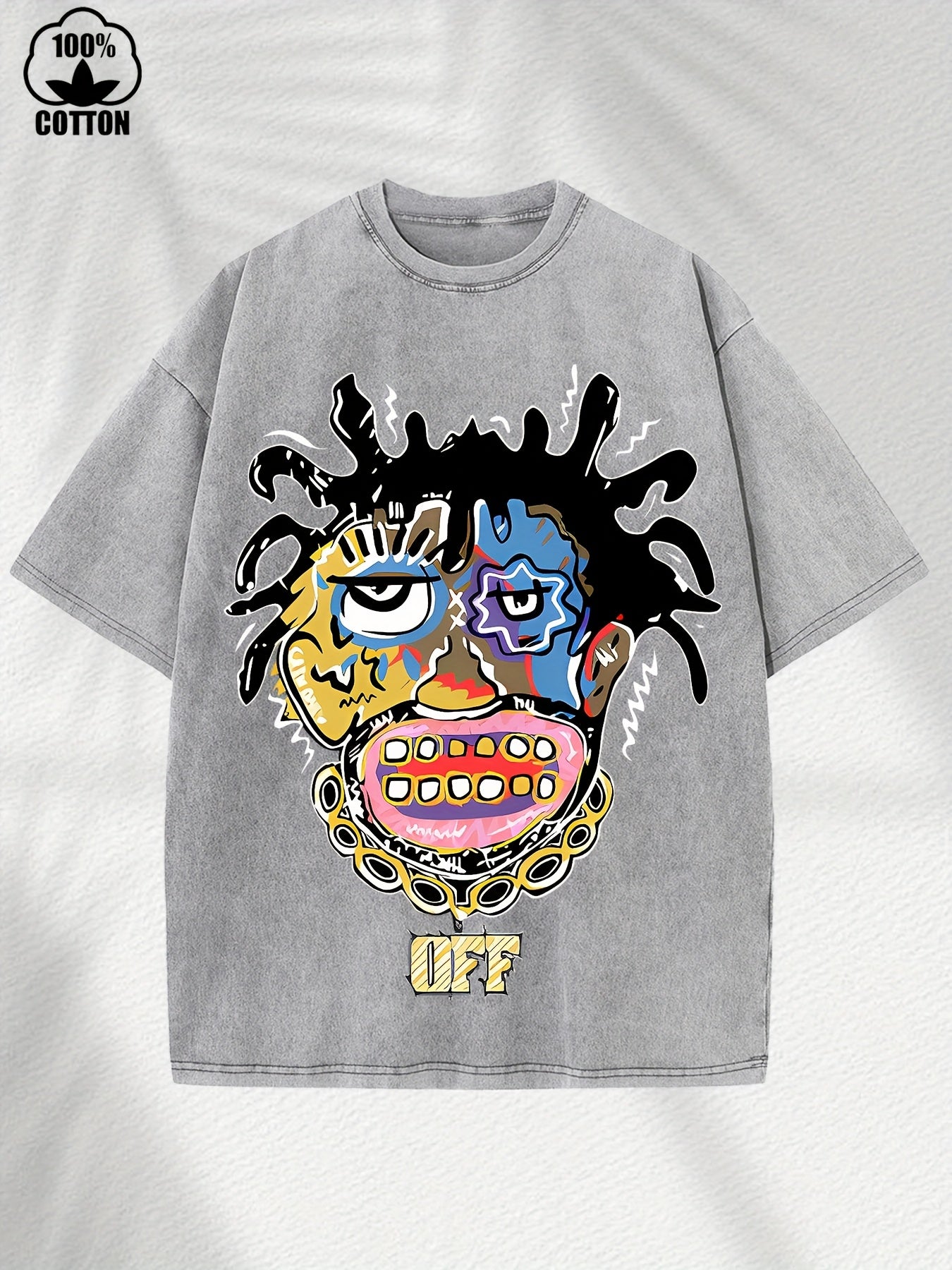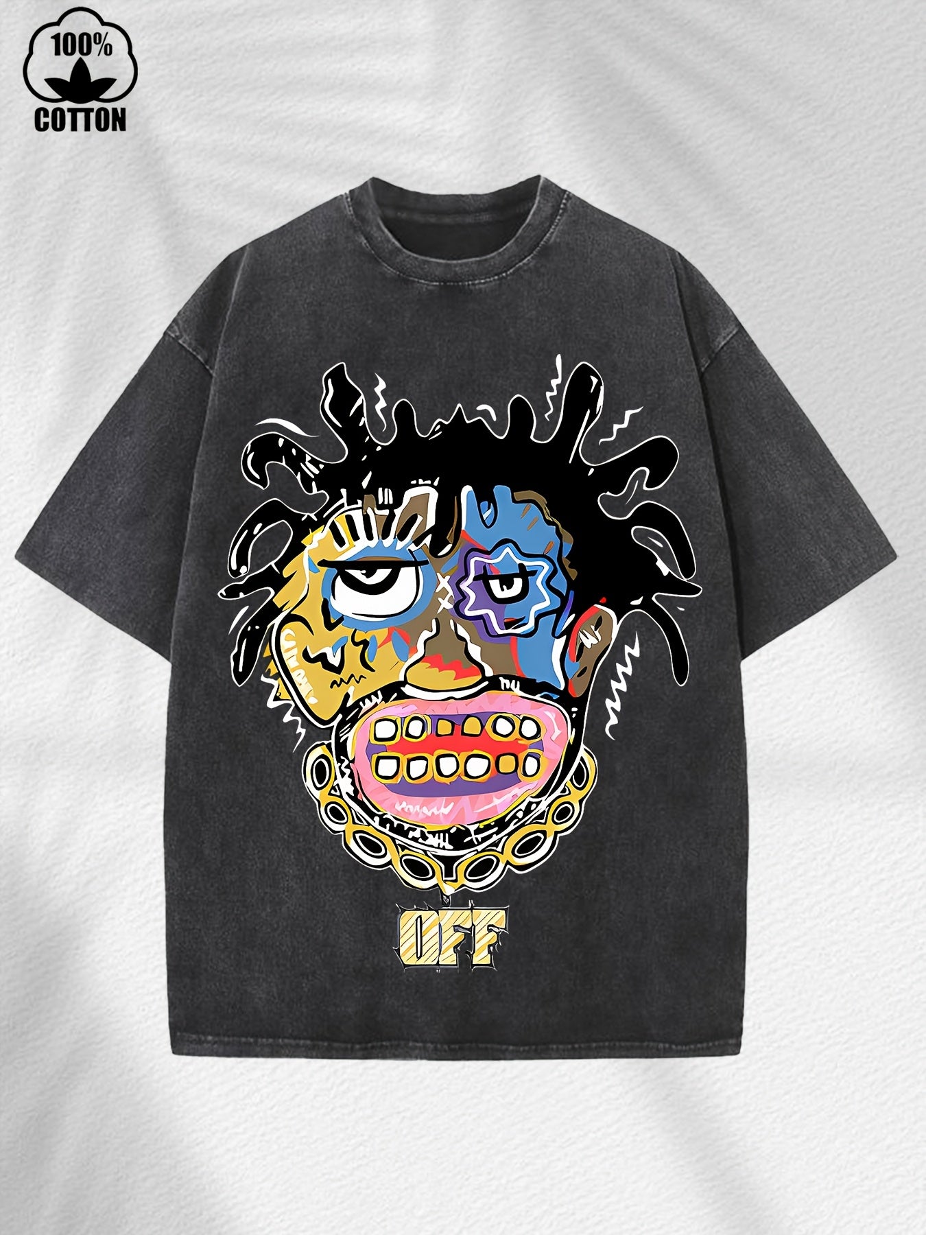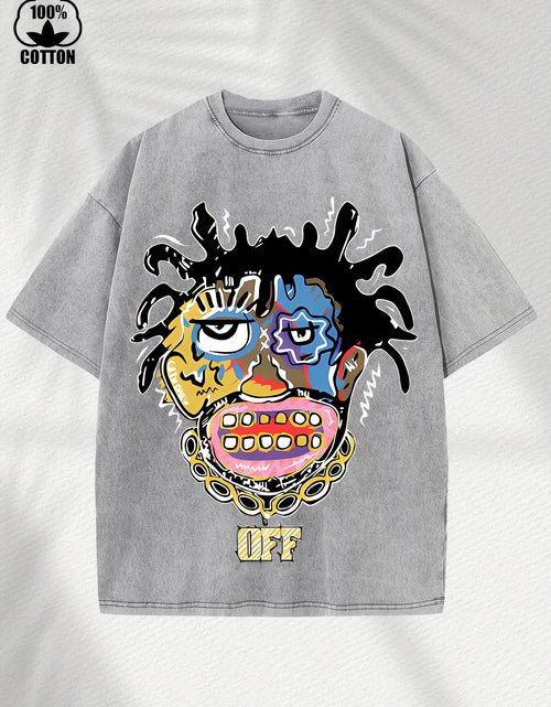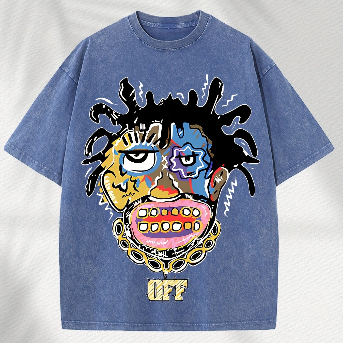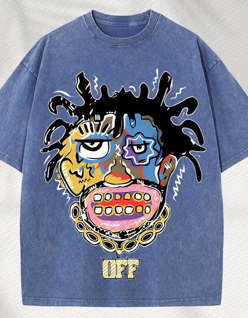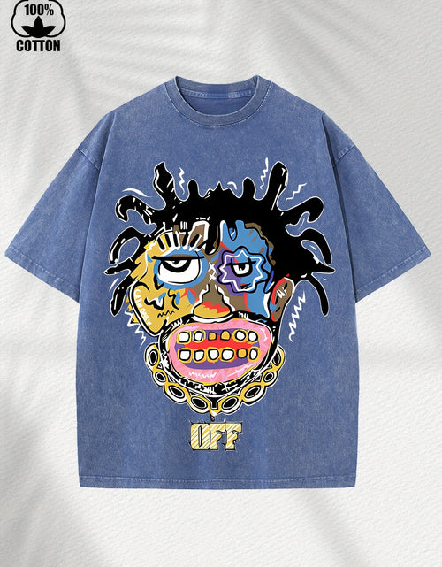 Home Relaxation | Men's Trendy Washed Cotton Graphic Tee - Blue Short Sleeve with Colorful Abstract Face & "OFF" Print, Casual Summer Shirt