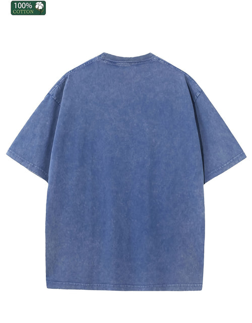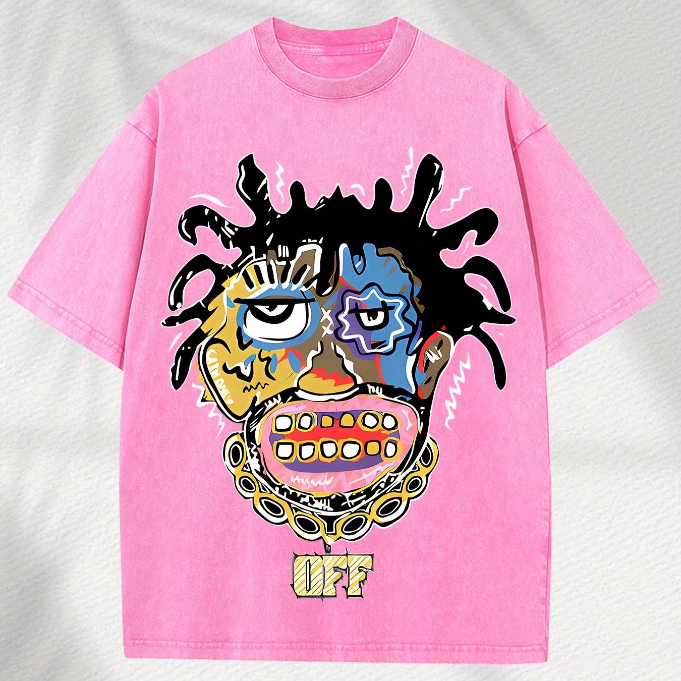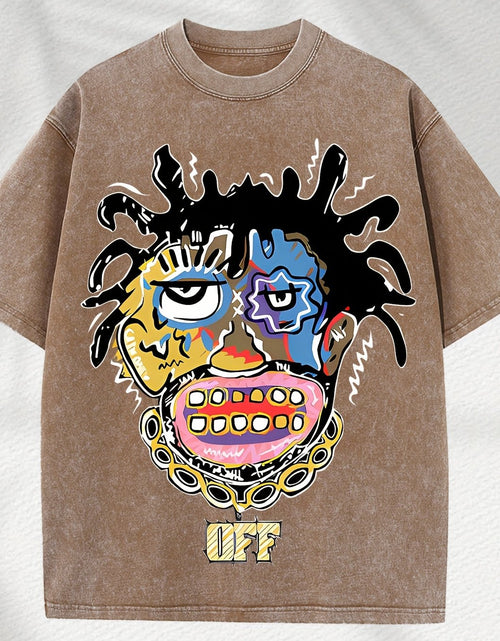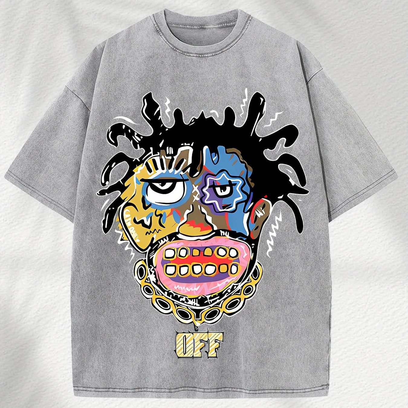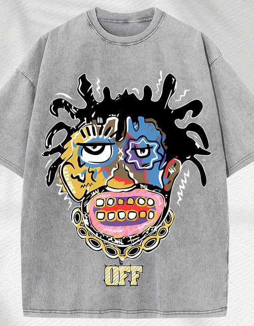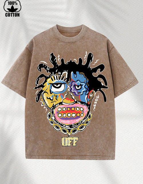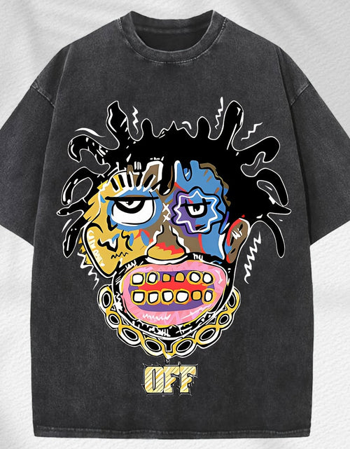 Home Relaxation | Men's Trendy Washed Cotton Graphic Tee - Blue Short Sleeve with Colorful Abstract Face & "OFF" Print, Casual Summer Shirt