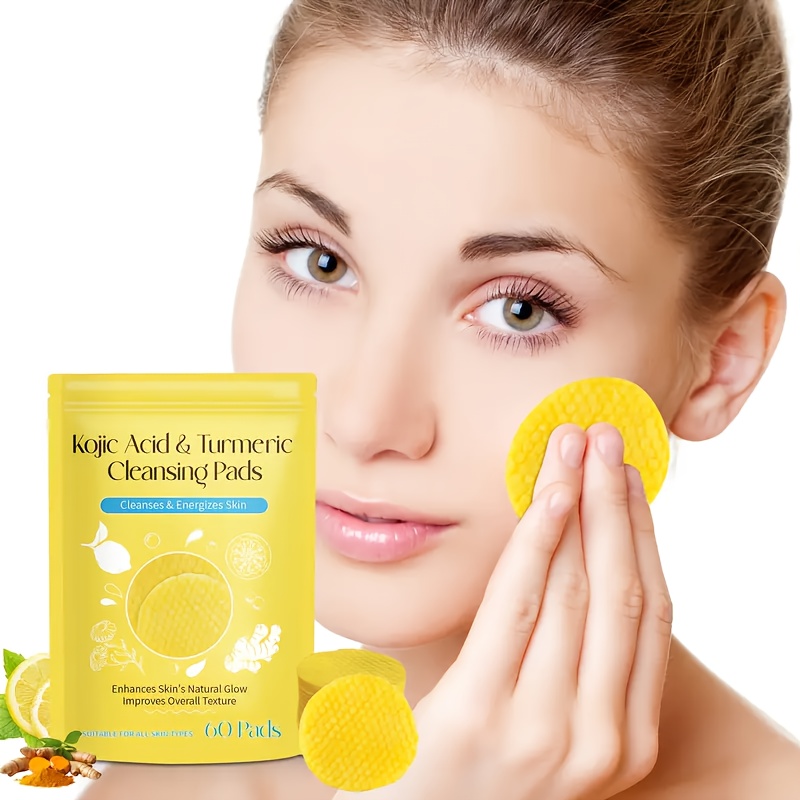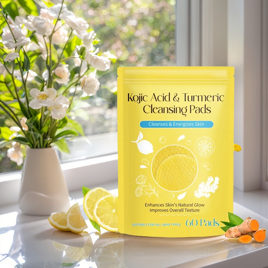 Kojic Acid & Turmeric Cleansing Pads: 60 Pads with Double-Sided Texture for All Light Beige Types - Gentle, Non-Irritating, And Infused with Curcumin, Chamomile, And Turmeric for A Natural Glow