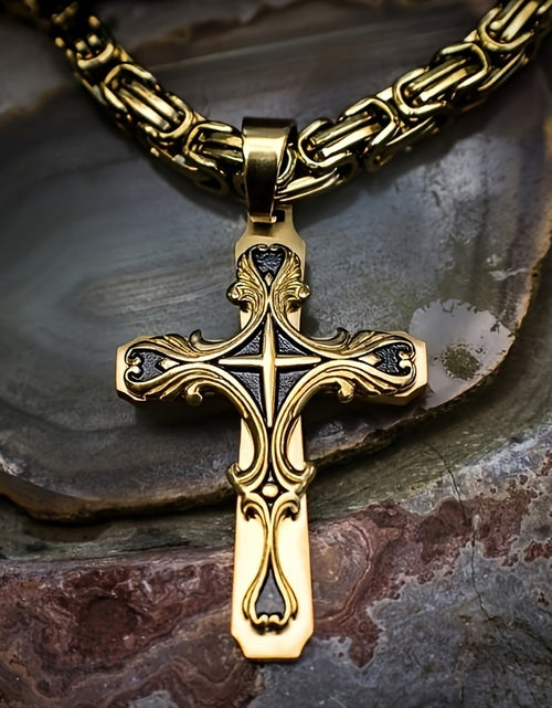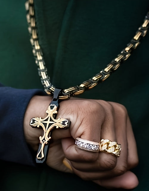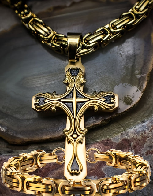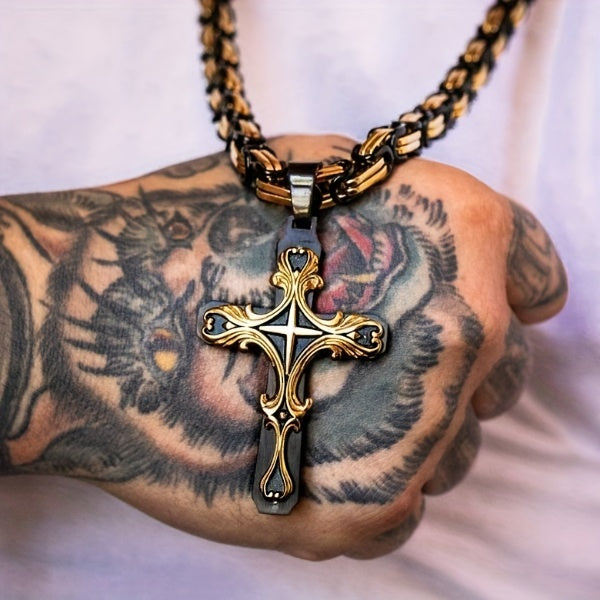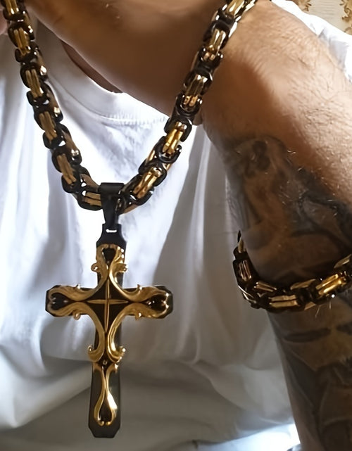 Men Stainless Steel Cross Necklace Set 2pcs Cuban Chain with Cross Pendant Retro Fashion Jewelry for Men