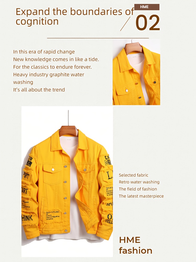 Men's Heavyweight Denim Jacket - Oversized Retro Streetwear Coat with 3D Patchwork Design, Single-Button Closure, Machine Washable, 4-Pocket Construction (Yellow/Black)
