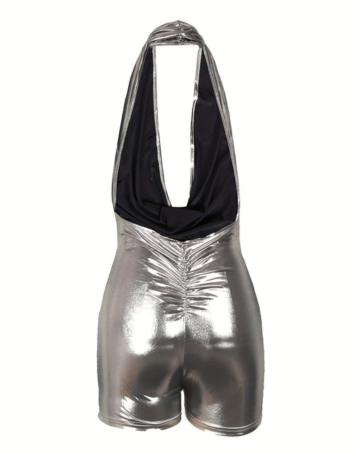 Sexy Halter Neck Bodycon Romper - Elegant Metallic Deep V-Neck Sleeveless, Backless Design, Stretchy Polyester Blend, Perfect for Summer Evening Events