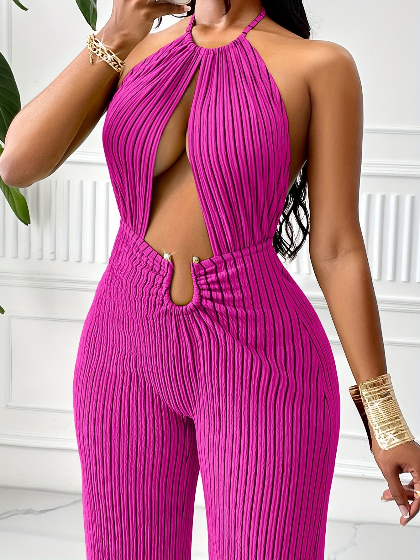 Vibrant Pink Striped Halter Neck Jumpsuit with Cutout Detail - Polyester, Knit Fabric, Backless Design, Metal Decorative Buckle