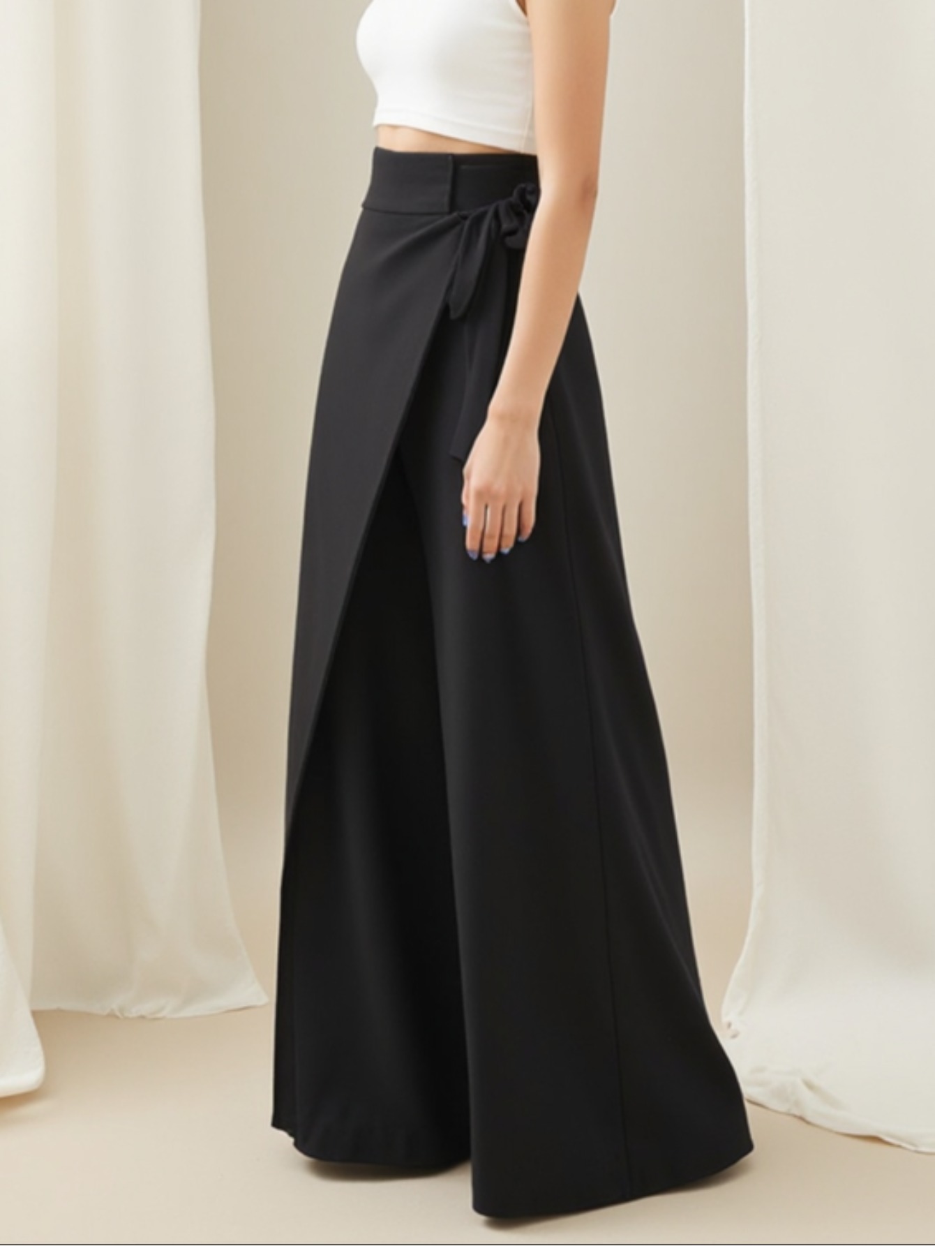 Women High-Waisted Wide-Leg Trousers with Tie-Front Waist & Belted Collar - Elegant Winter Pants for, Commuting, Dates - Non-Stretch Fall/Winter Outfits (Solid Black) - Hand Washable
