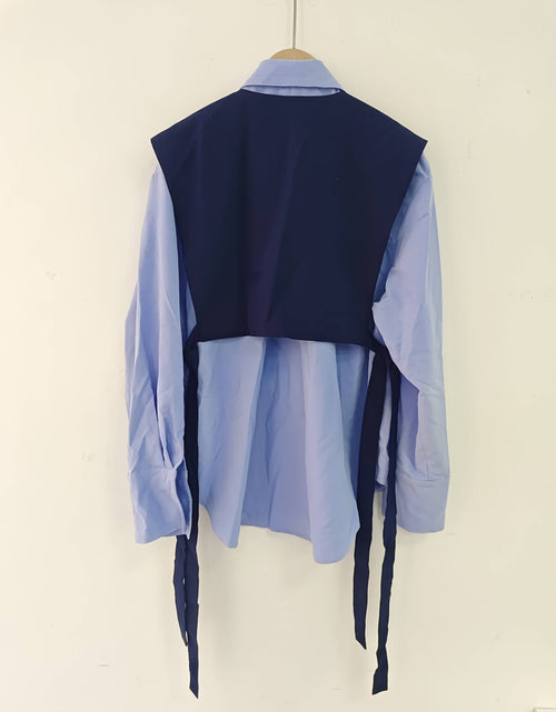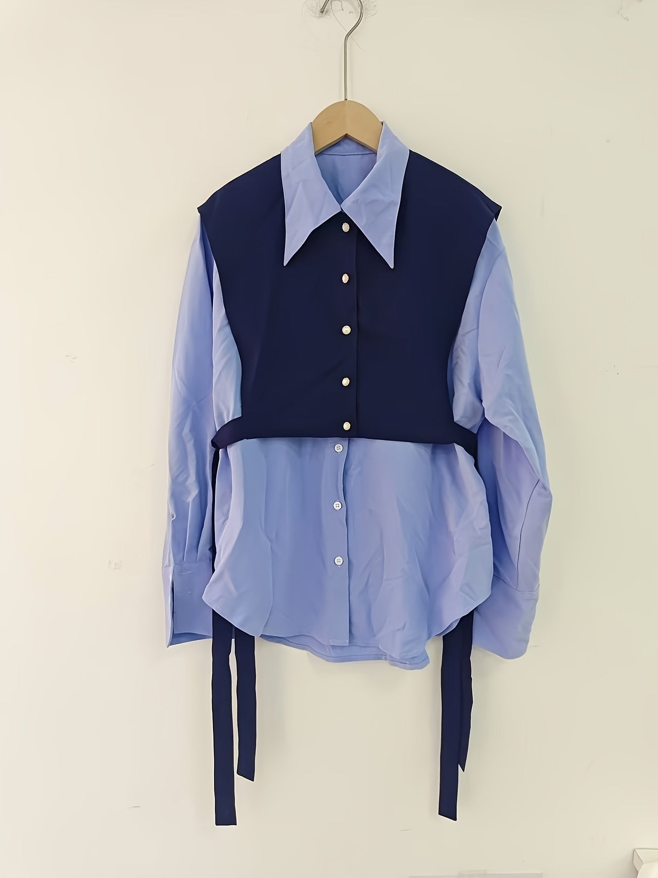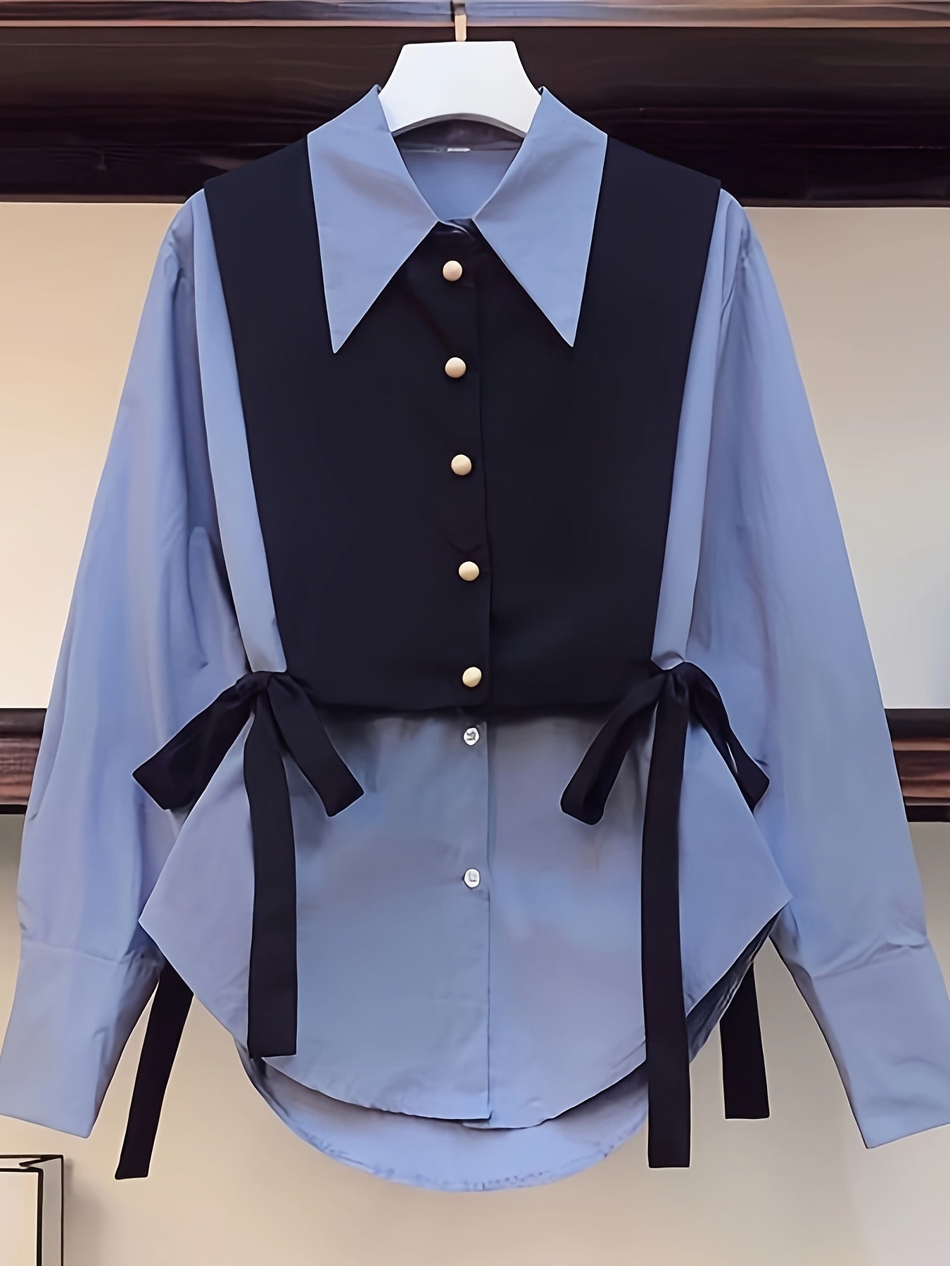 Women Layered Tie-Front Blouse, Polyester Solid Color Long Sleeve Shirt, Lapel Collar, Double Layer Design