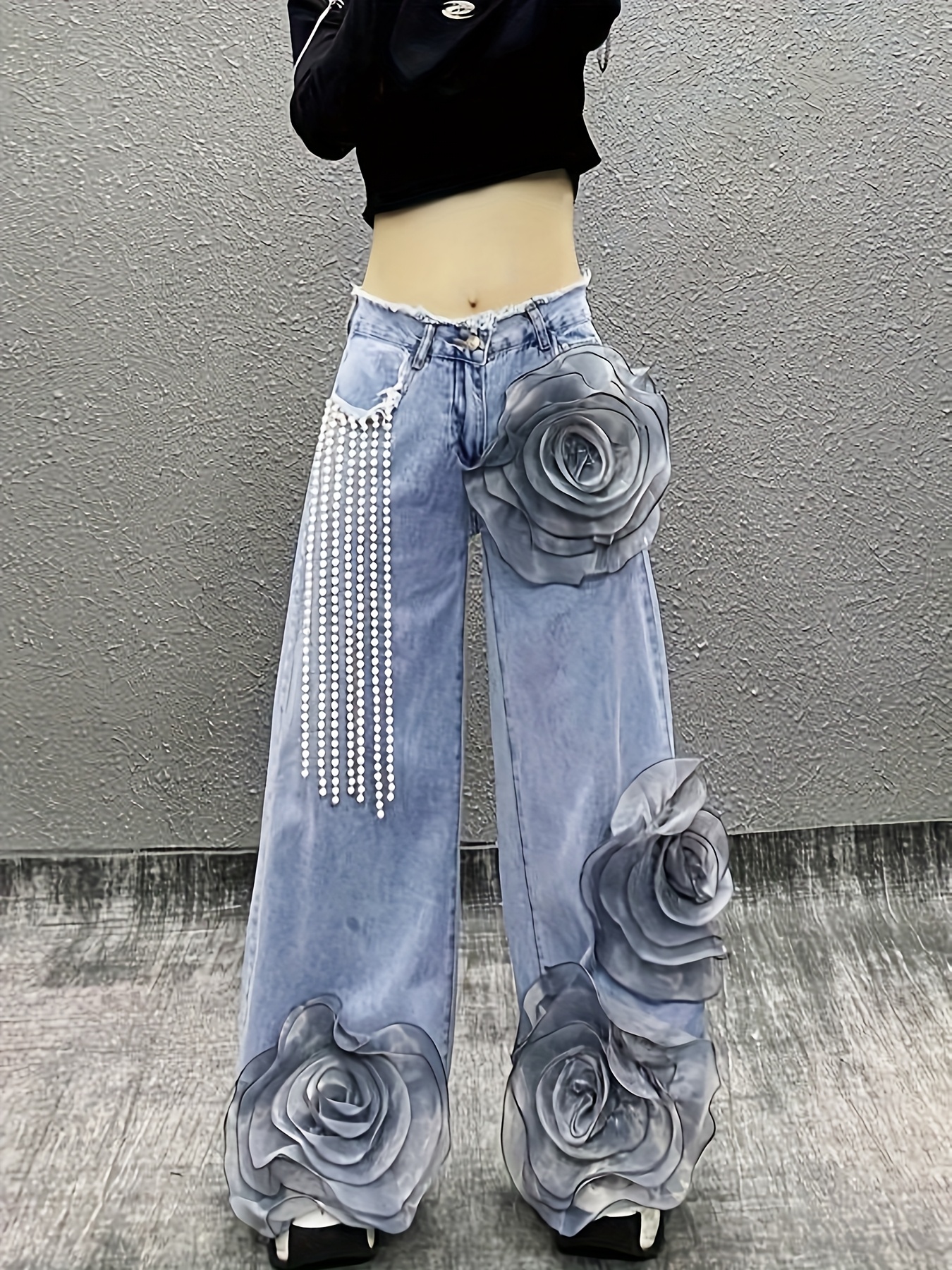 Women Mid-Waist Wide-Leg Jeans, Adorned with 3D Flowers And Pearl Pendant Chains, Are Stylish And Versatile Denim Pants Suitable for All Seasons And Various Occasions