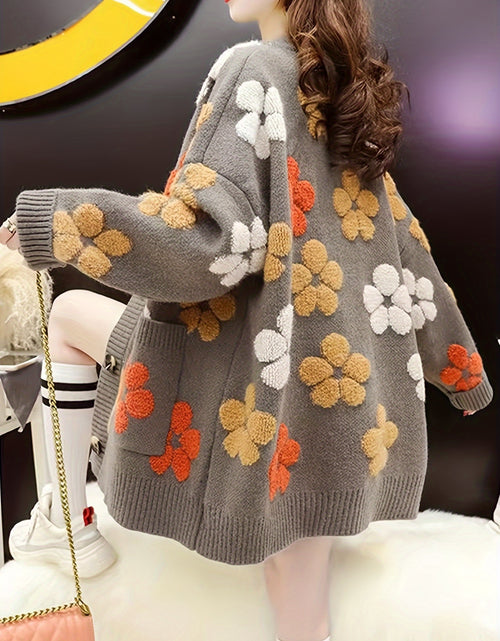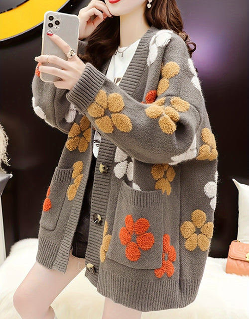 Women's Flower Print Cardigan V-Neck Short Eye-Catching 100% Polyester Button Detail Micro Elasticity Casual Knit Cardigan