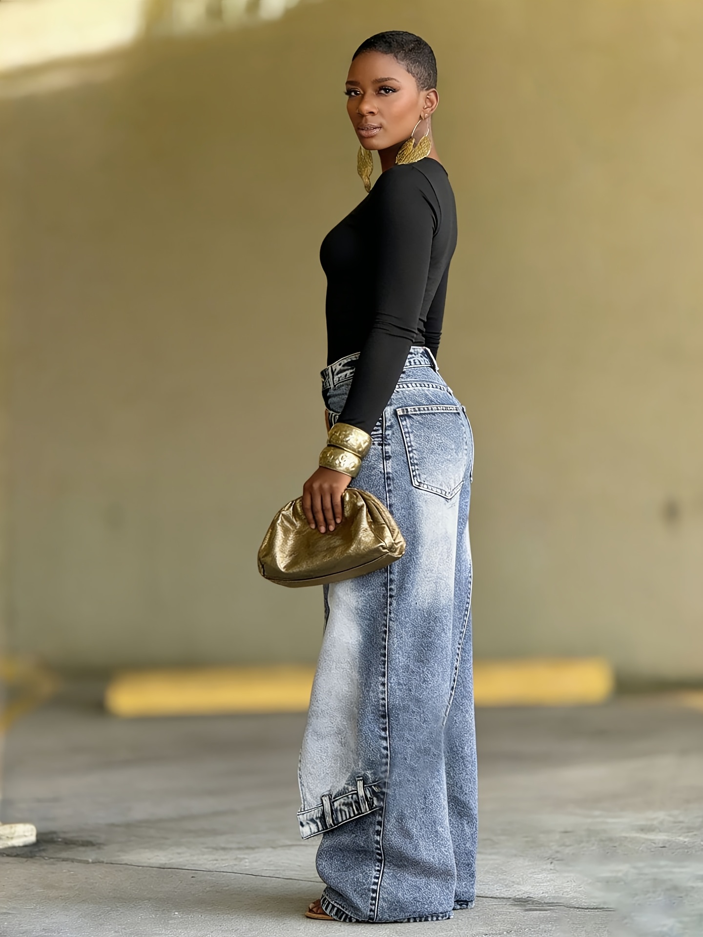 Women's Jeans with Unique Asymmetrical Cut, Distressed Wash, Loose Tapered Fit to Conceal And Slim, Pair with Metallic Accessories to Instantly Become A Street-style Icon